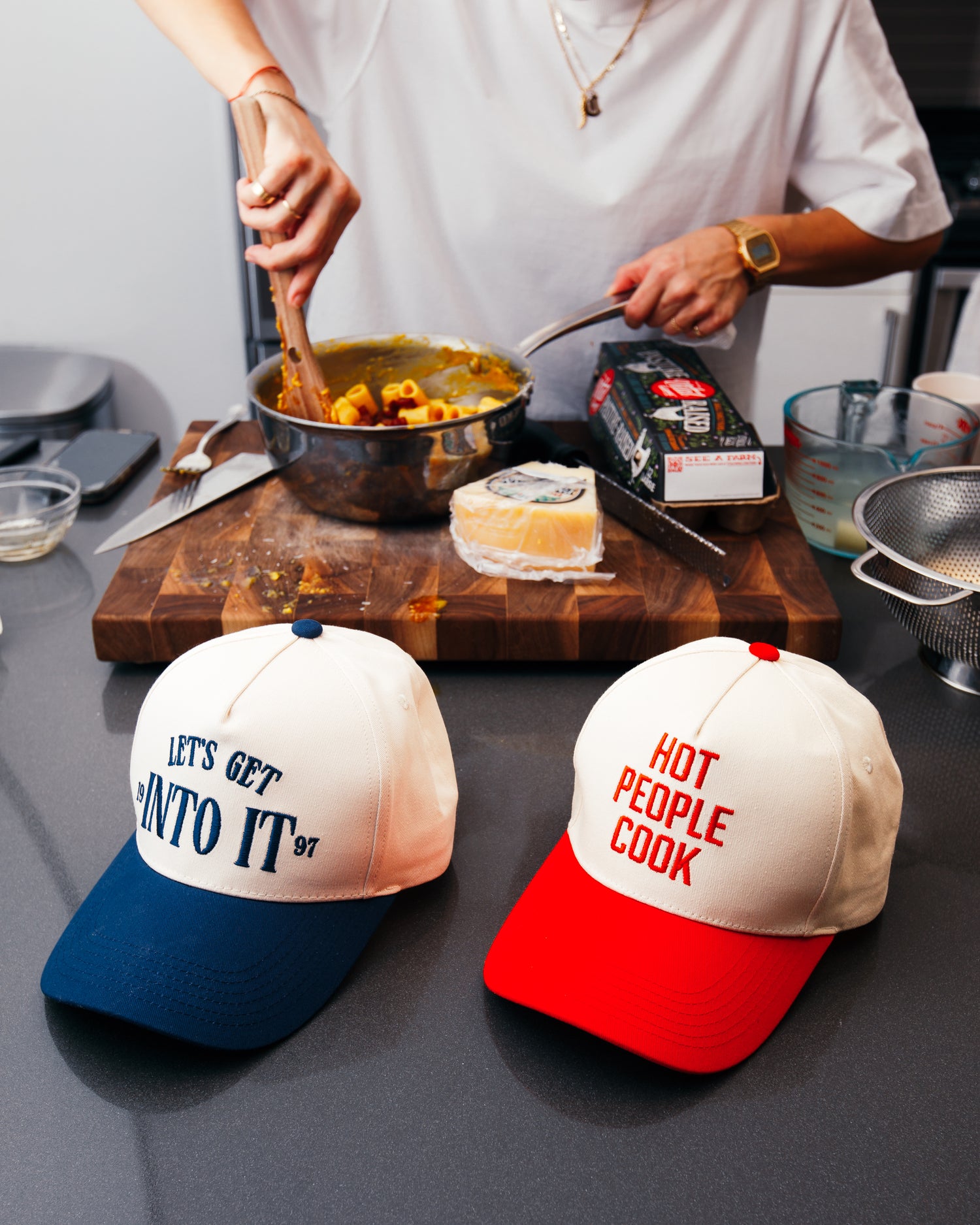 I love both designs for different reasons. “Let’s get into it” is obviously close to my heart—it’s how I kick off every video and feels like my unofficial mantra. “Hot people cook,” on the other hand, is more laid back and quite frankly couldn’t be more true. These hats are beautifully made, one-of-a-kind, and I’m so proud of them. I hope you love them as much as I do.